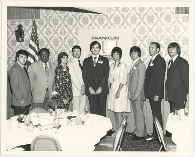 This photo features a row of alumni posing together at their reunion in 1976.