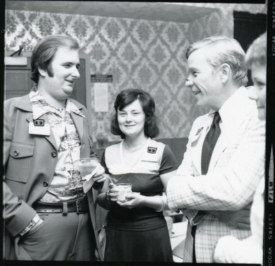 This photo features a group of alumni chatting together at the first Alumni Days, 1976.