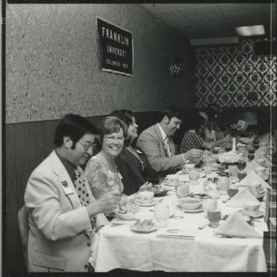 This photo features a group of alumni enjoying dinner together at the first Alumni Days in 1976.