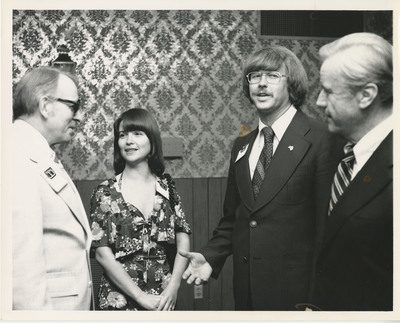 This photo features a group of alumni together at the first Alumni Day in 1976.