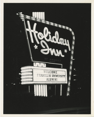 This photo features the sign on Holiday Inn to welcome Franklin alumni during the first Alumni Day event in 1976.