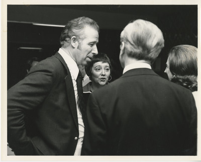 This photo features a group of alumni talking together at the Annual Alumni Dinner.