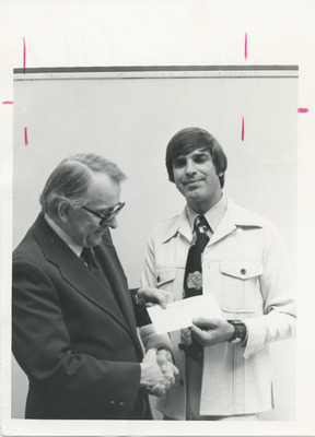 This photo features two alumni shaking hands at the 1976 reunion.
