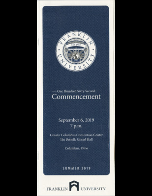 This Franklin University commencement program was published for the 162nd commencement ceremony on September 6, 2019 in The Battelle Grand Hall at the Greater Columbus Convention Center in Columbus, Ohio.
