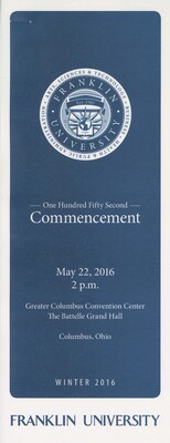 This Franklin University commencement program was published for the 152nd commencement ceremony on May 22, 2016 at the Greater Columbus Convention Center, Battelle Grand Ballroom in Columbus, Ohio.