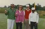 This photograph features four alumni posing for a picture on the course at the 1993 Alumni Golf Outing.