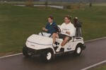 This photograph features two alumni driving on a golf cart at the 1993 Alumni Golf Outing.